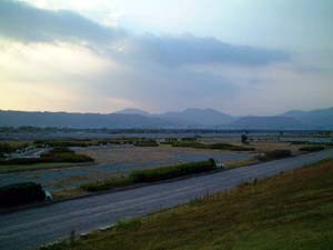 広い! 桁外れに広い! はっはっは。ちょっと笑ってみるかな。 だいたい島田市博物館の前から、大井川橋までの距離がまた遠い。 ただでさえ遠いのに、河原には、東海道五十三次のミニチュア・モニュメン トが広大に広がっている。やっぱり取材しておかないといけないよなあ。 iモード・ゲームで『さくま式東海道五十三次』を配信している人間として は、このモニュメントについて知らない、見なかったとは言いづらい。 行くしかない。河原に降りる。 ![]()