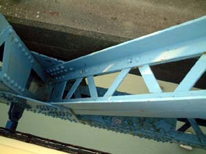 ぎょえ〜〜〜。いちばん苦手な砂利道だあっ。 歩くだけでもつらいのに、旅行用カートを手に持たないといけない。きょう はとくに荷物が多いんだよ〜。 河原には、東海道五十三次のそれぞれの宿の小さな壁画と、その宿場を歌っ た句などが碑となって、刻まれていた。 これに似ているのは、舞阪(まいさか)の松並木でも見たことがあるな。 大井川に沿って、宿場と宿場の間が、10メートル間隔ぐらいで石碑を置い ている。とても全部を見る気にならない。地元の人には憩いの場所だが、旅人 には、よけいな公園だ。 川沿いの道路を、車の往来に気をつけながら、大井川橋へ。 よかったあ。ちゃんと車道と、歩道が分かれていた。 東海道はけっこう、歩道がなくて、車に気をつけないといけない道が多いの だ。 さ〜て、気合い入れて歩くか! イチ、ニッ、イチ、ニッ、イチ、ニッ。 大井川橋の車道のほうも、鉄橋。歩道も鉄橋。クリーム色に塗られた欄干と いうより、手すりのようなものがあって、手すりの向こうは、大井川。 車道と歩道の間は…、げっ。河原が見えるじゃないの! いかんよ。高所恐怖症に、こういう景色は…。 なんていいうか、その…、恐いじゃないか。ほかに言い方ないんかい! ![]()