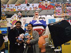 1月21日(金) 午前11時。西武新宿線上井草駅前「細見デンタルクリニック」 に嫁と行く。 奥歯を1本入れた。7万円! 高いねえ! 午後12時。荻窪駅で、土居ちゃん(土居孝幸)と待ち合わせて、 ひさびさに荻窪駅南口の「釜膳(かまぜん)」に行く。 ここの釜飯は、みんながイメージしてる釜飯とまったく違って、 豪華で美味しい。 今でもグルメ・バカ娘が思い出したように「釜飯! 釜飯!」と 要求する。今の家からだと遠いので来れないのだが、杉並区の家だ った頃には、しょっちゅう来ていた。 もちろんデジカメで、ここの釜飯をみんなに伝えようと思ったの だが、珍しいことに、嫁がデジカメを持ってくるのを忘れた。この あとも写真が必要なので、土居ちゃんにデジカメを貸してもらうこ とにした。 しかし、やっぱり土居ちゃんであった。 デジカメを持って来てくれたのはいいのだが、充電がほとんどな くて、あと1〜2枚撮れるかどうか。 土居ちゃん(土居孝幸)に頼った私がバカだった。 なにしろ土居ちゃんは、旅先に携帯電話を持って来ても、カバン の底に入れっぱなし。お土産を買ったら必ず忘れて行くような、の んき星人なのだ。 で、釜飯。 1杯目は、ふつうに釜飯として食べ、1杯目は、釜にこびりついた おこげをへらでこそげ落とし、それにお出汁を入れて食べる。 このお出汁が何とも、馥郁(ふくいく)たる香りで、美味礼賛な のだ。 午後2時。土居ちゃん(土居孝幸)、嫁といっしょに水道橋駅まで。 今年の『ふるさとフェア』のポスターの絵を土居ちゃんが描いて いるのだ。水道橋の駅を降りたところから、土居ちゃんのポスターだらけな ので、かなり感動的。 土曜、日曜とまだ2日間開催されているので、近くに来る用事が ある人はぜひ水道橋駅で、土居ちゃんのポスターだらけを見てねー。 東京ドームの『ふるさとフェア』に行く。 47都道府県に混じって、なぜかハドソンブースがある。一体ど この県の出展なんだ? 人がなかに入る巨大キングボンビーのぬいぐるみがあって、とっ ても異様。こりゃ目立つは! このぬいぐるみのなかに、梶野竜太郎くんが入って、会場を練り 歩く。受ける! 受ける! 都道府県の出展者の人たちがみんな『桃 太郎電鉄』を知っているようで「あっ、キングボンビーだあ!」と か「貧乏神だー!」と叫んでくれるので、うれしい。 そうそう。ハドソンブースに行くと、桃太郎のバッジがもらえる よ! 休日の予定の無い人は、ぜひ「ふるさとフェア」へ! 当日券は600円です