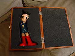 ねっ。おもしろそうでしょ? 声優の神谷明さんが音響監督をやっているのだ。こういう人選っ ておもしろいよね。遊んでるんだ、この企画。 盛大に遊びたいんで、コンセプトだけひろたたけしに伝えて、お まかせで作ってもらっている。案の定ヒーロー大好き人間が集まっ て作ってるので、当初の制作費が倍になってしまっているようだ。 そいつは困った。 ラジオ・ドラマのCDのほうが、早く発売できるらしい。 今後この『Jヒーローズ』という単語を知ってると、かなり自慢 できますぜっ! さて、いよいよ、岡悟さんが作った、鉄腕アトムのフィギュアを 購入する。豪華な木箱に入ったアトムのお出ましだ! ![]()