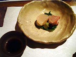 いいでしょう? やっぱり買ってしまったんだなあ。 一時期のフィギュア熱は冷めてしまったんだけど、こういう作者 の顔を知っていて買うというのは、一種陶芸の作家さんから器を買 うのに通じていていいなあ。 きょうなんか、作者本人がわざわざ持ってきてくれるんだから、 贅沢なものだ。 ひろたたけしがうらやましがって、「鉄人28号のパンフレット はありませんか?」と岡さんに聞いていた。やっぱりひろたは買う 気だな? ちゃっかり『Jヒーローズ』のフィギュアも作ってほしいと言い 出していたから、今後また『Jヒーローズ』は不思議な展開を見せ 始めるかもしれない。 とにかくこの『Jヒーローズ』という単語は、この日記でも出て くる回数が増えていくと思うので、お楽しみに! こんなところで『Jヒーローズ』の名前を見たという通報もよろ しくね! 地下活動が頻繁なゲームなのだ、これは。私のメジャー 路線とは違っていて、ちょっとおもしろそうでしょ? 午後4時。みなさん、お帰りになって、私は花粉症の薬が効き始 めて、ソファにぶっ倒れたまま、寝る。鼻はひりひりのまま。 午後7時。青山骨董通りの和風料理屋「えさき」で、ナムコの岸 本好弘さんと待ち合わせ。うちは家族3人。 じっくりこの「えさき」の味を楽しもうという催し。 やっぱりここの味はいいなあ。 ただこのおいしさは非常に微妙で、仕掛けが少ないので、文章で 書いても、写真に撮っても、なかなか伝えづらい。前菜から始まっ て、メインディッシュまでの組み立てがとにかく絶妙。 今年から横浜ベイスターズに移籍した小宮山投手みたいな感じか なあ…とそろそろ球春が近くなってきて、また横浜ベイスターズの 動向が気になる時期になってきた。 ![]()