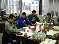 午後3時30分。今度は『桃太郎電鉄V』の反省プレイ。 プレイヤーは、宮路一昭くん、国政修くん、石崎仁英くんの3人。 このプレイをみんなで見ながら、問題点を上げて行って、討議す る。初めてプレイする人にとっては「ちいきデータ」「いけるかな?」 のコマンドの意味もわからない人がいるだろうから、ヘルプコマン ドつけたほうがいいんじゃないか?といった、こまかい部分まで、 検討する。 ゲームのほうは、石崎仁英くんがひさびさに見る『桃鉄不運男』 なので、私にとっては、ひさびさにうれしいクランケ(患者)だ! 上級者にとっては、ブロックカードは常に3枚は用意しておくも のなのだけれど、石崎仁英くんは、絶対に買わない。 まんまと、宮路一昭くんのいじわる系カードの餌食だ。 しかも急行カードをつかえば、2が出る。 どうせ少ない数が出るからと、目的地まであと6マスくらいのと ころで、急行カードをつかって、まんまと10以上出る。 圧巻は、貧乏神を引き連れて、トラベル・チャンス!のイベント。 「トラ□ル」の□の部分が、トラ<ブ>ルになったり、トラ<レ> ルになったり、トラ<エ>ルになったりする。 唯一、めったにならないのだけれど、トラ<ベ>ルと出ると、目 的地のそばまで、ヘリコプターで飛ぶ。 こんなレア・イベントを石崎仁英くんが出したのだ! ところが石崎仁英くんがいた場所は、目的地のとなりのマス。 あわれ、せっかくトラベル・チャンスを出したのに、目的地から 遠ざかったのである。 おいしいキャラクターだ、石崎仁英くんは! ![]()