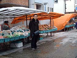 暗い私の気持ちを映すかのように、空が一転曇り出した。 曇り出したと思ったら、いきなり大型のクーラーを回し始めたよ うに、寒気が襲って来た! ひ〜〜〜、ついに寒さを体験か? うひょ〜〜〜、雨まで降り出した。 雨の粒が、冷たいよ〜。 どんどん気持ちがブルーになってくる。 「何で輪島行きを廃線にしちまうんだよ〜!」 うつろな顔で、朝市を歩く。 「お兄さん! お兄さん! 買うてって〜!」 「お姉さん! お姉さん! 安くするよ〜!」 冬場は、寒いので、朝市に出る屋台は4分の1程度だそうだ。 『がきデカ』の作者・山上たつひこサンが、一時流行させた「輪島 の朝市、婆あちゃんだらけ!」というフレーズを思い出す。 まさにその通り。 「えがらまんじゅう」という人気のおまんじゅうを買い食いしてみ たけど、ちょっと甘すぎ。あんこをご飯でくるんでいるのだが、こ のご飯がまっ黄色なので、ちょっと不気味。 くちなしの花で、この黄色い色を染めると書いてあった。 午前11時。朝市のはずれで、運転手さんが迎えに来てくれた。 雨が激しくなってきた。いよいよ本気を出すつもりだな。 こっちには、秘密兵器もあるんだぞと、ちょっと武者震い。 朝市を出て、運転手さんが、異形な岩が並ぶ、袖ヶ浦にまず連れ て行ってくれた。 ますます寒い。 ここでかねてよりの、秘密兵器。東京で買って来た、対北陸戦用 の帽子を着用する! 耳も隠れて、あたたかい! ![]()