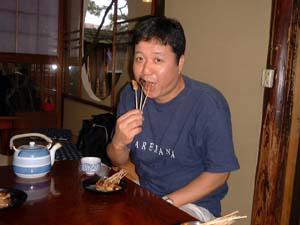 ドンガラガシャーーーン! わっ、びっくりした! 何だ、この音は! そうか、そうか! 土居ちゃんの音だ。 土居ちゃん(土居孝幸)は、いつも旅先でたまったお釣りを、全部こういう神社の お賽銭に投げ込んでしまうんだった。 初めて、この土居ちゃんの派手なパフォーマンスを見た人は、びっくりする。 まったく土居ちゃんは、信心深いのか、面倒くさがりなのか、よくわからん。 あぶり餅の「かざりや」に入る。 「ご飯食べたばかりで、ちょっと…」といっていたカズ坊(関口和之)が、ほいほい あぶり餅を食べている。 「食べてる自分がこわい…」とカズ坊がぽつり。 うちの娘は絶好調。1皿追加して「ふに〜!」とうれしそうな顔をしている。 土居ちゃんもうれしそうに食べている。 ![]()