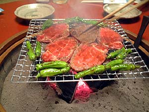 火鉢の遠赤外線の炭を見つけながら、肉が焼けるのを待つ。 やわらかい肉が、焼きあがる。 ぺろり。う〜む。美味しいなあ! タマネギを食べる。甘くて美味しいなあ。 戸田圭祐が「最近ようやっと、野菜が美味しいことがわかって来ました。お肉という のは、すごく美味しいお肉と、美味しいお肉の2種類でっけど、野菜は、美味しい野菜 と、まずい野菜の2種類があると思いまへんか?」 相変わらず心を打つ言葉ではないが、どことなく言いたい事が、かすかに伝わる解説 である。 ![]()