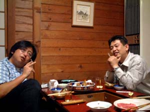 松茸に詳しい方は、10人で、3キログラムの松茸を食べてしまったことで、仰天し ていただきたい。まさか私たちもこんなに食べるとは思わなかった。 ふつうハンバーグステーキで、少食の人が食べるお肉の量が、150グラムなのだか ら、恐るべき松茸の消費量なのである。 松茸だけで、3キログラムとは、本塁打だけで、打率3割を越えるみたいだな。 確かにそれだけ食べた。お肉も。 とにかく、ふだんは美味しさを表現する天才たちが、「うん、うまい!」「これ、お いしい!」「いやあ、うんめ〜〜〜!」としか言えなくなっているのだから、仕方無い よね〜! 初出場の柴尾英令くん、成沢大輔くん、整体のお兄ちゃんの3人は、最初のうち、あ まりの松茸の大きさと香りのよさに、まるで蟹をほじっているときのように、寡黙にな っていたもんなあ。 まあ、気づけば、最後の松茸ご飯を、整体のお兄ちゃんが、5杯も食べて、そのすご さを轟かせて、お開きとなった。 何度も、何度も、記念撮影! 柴尾英令くんの日記用に。 私の日記用に。 すぎやまこういち先生の写真コレクション用に。 終いに、誰のためのシャッターだか、わからないまま、カメラを向けられると「にこ 〜〜〜!」。 ![]()