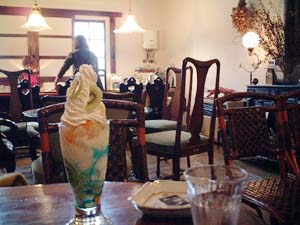 午後12時30分。骨董と甘味のお店「ひし伊」に入る。 函館の観光ガイドには、必ず載っている茶房で、蔵を改造したお店。嫁と娘は何回 か来ているようだ。私は初めて。 長旅で疲れているので、つい「ひし伊風パフェ」を食べてしまう。北の大地は乳製 品が美味しいから、どこで食べてもパフェが美味しいのだ。1週間の旅行で、4キロ グラム体重が増えたという人がいるくらいなのが、北海道である。 ![]()