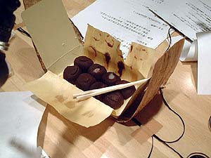 この「のど焼けだんご」は、8個。ひとつだけワサビが入っているという、お笑い番組 の必需品のような食べ物。 これを別に放送するわけでもないのに、みんな集まって真剣に誰から食べるかジャンケ ンして、順番に食べる。 どういうわけか番組企画のように、『有限会社 桃太郎商店』の出演者4人がジャンケ ンに勝つ。 堀越のりチャン、セーフ! 私、セーフ! 石塚義之くん、セーフ! 石井正則くん、セーフ! ![]()
