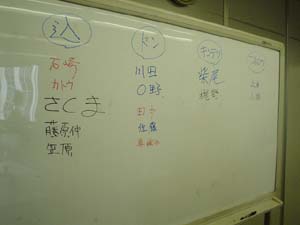 本家の「太老樹(たろうき)」が、昨年の夏以降、まったく予約が取れないほ ど大繁盛してしまったので、こっちに来ることが増えそうだ。 このお店もそのうち行列が出来てしまうかも。 午前11時30分。おなじ松竹ビルの「カフェ・セレ」でコーヒー。 午後12時。築地のハドソンへ。 本日、札幌開発スタッフの込山勉くんが、どっこいズ(井沢どんすけ、すとろ う小泉、石川キンテツ)と対決する。 その前に、昨日残した打ち合わせの続きをやる。 メンバーは、私、嫁、土居ちゃん(土居孝幸)、柴尾英令くん、、札幌開発ス タッフの企画担当の川田忠之くん、込山勉くん、加藤和美さん、小坂晃弘くん、 美術設定の佐藤裕くん、ミドルデザイナーの笠原圭介くん、メイン・プログラマ ーの田中俊介くん、東京ハドソンの梶野竜太郎くん、宣伝部の石崎仁英くん。藤 原伸介くん。 午後1時。明日の「ジャパンカップ2003決勝大会」にゲスト出演するショ ッカーO野くんが打ち合わせのために到着。 『桃太郎電鉄』シリーズで、ショッカーO野くんの名前を知っていても、実際に ショッカーO野くんを見たことがある人は少ないと思うので、明日の「決勝大 会」に来る人たちへのビッグ・サービスとして、登場してもらうことになった。