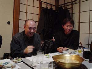 岩崎誠と、中井保さんがおなじ歳とわかって、すっかり垣根が取れた様子。 上田さんも、食い道楽で、京都のおいしいお店もほとんど行っていて、やっぱ り食べ物の話は、最良のコミュニケーション・ツールであることを痛感する。 午後8時45分。岩崎誠が東京に戻らないといけないので、退席。 体調不良で、死にそうな顔をしていた柴尾英令くんは、はりはり鍋と、焼酎 で、すっかりいつもの酔っ払いおじさんに戻っていた。 このお店のはりはり鍋は、感動ものなので、さっそくメモ。 <むらさき> 住所:大阪市江戸堀1の15の4 電話:06(6441)3871 営業時間:17:00〜22:30 定休日:土日祝日休。 備考:土佐堀通りの北京料理の「徐園」の門が目印。 はりはり鍋は、関西の名物料理だから、『桃太郎電鉄』の大阪の物件に加えて もいいんだよなあ。ちょっと検討してみよう。 間違いなく、今度またこのお店に来るぞ。 午後9時。私、嫁、土居ちゃん、柴尾英令くんの4人は、京都に向かう。 毎日放送の人たちと、大里専務、梶野竜太郎くんたちは、次のお店に行ったん だろうなあ。 帰り道、酔っ払いターボ・エンジン全開の柴尾英令くんが、「楽しいね〜!」 「幸せだなあ!」「あっ、傘をクイック・マッサージに忘れてきた」「いやあ、 あのお店の焼酎はおいしかったなあ」と、独演会状態。 午後10時。京都のマンションに戻る。 ベッドにひっくり返る。 さすがに大阪城の疲れが出てきた。 風呂入って、寝る。