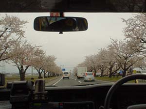 でも、この美しい桜並木が始まるや、雨の粒が大きくなった。 う〜〜〜ん。やっぱり、ダメかあ…。 車も渋滞してきた。 「桜まつりのせいだね…」 「この渋滞がですか?」 「うん。そうだね…」 「弘前城までは、もう少しかかりますかね?」 「うん。もうしばらく、かかりますね…」 NHKが見えてきた。 その向こうに、桜がちらっと見えた!