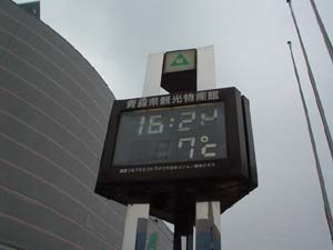 弘前から、青森までは、普通列車でも、48分。近い。 撫牛子駅? なでる・うし・こ? 「撫牛子駅」と書いて、「ないじょうし」駅? 読めないよ〜! 途中、新青森駅に、駅舎完成予想図という看板があったようだけど、あれは新幹線 用の駅舎なのだろうか。 計画では、新幹線はいまの青森駅ではなく、新青森駅を作ると聞いているけど、こ の新青森駅のことなのだろうか。 午後4時1分。青森駅に着く。 雨がぽつぽつ降っている。 午後4時30分。アスパムへ。 青森県の観光と物産の情報基地だ。 地上15階、 高さ76mの正三角形ビル。 まるでスイカを三角形に切ったときののように薄いビルだ。