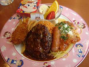 う〜む。焼きオムライスビーフカレーという仰々しい名前につられてが、やっぱり 不二家では、ハンバーグステーキを頼むべきだった! どんな四番打者でもノーヒットの日もある。 しかしひさびさの「不二家」だっただけに、ちょっと残念。 でも、「不二家」不滅のパフェがおまけについてきたから、大満足。 しかしさっさとパフェを食べて、嫁と娘に怒られる。 私がパフェを先に食べると、孫がごはんを食べずにパフェだけを食べたくなるからだ! し、し、しまった! 仕方がないので、ペコちゃんランチのピラフを孫の目の前で食べる。 すると最近孫は何でも私たちの真似をするようになってきたので、ピラフを食べた。 少しホッとする。 「不二家」で孫がペコちゃんの紙よだれかけをしているのがかわいくて、携帯で何枚も 写真を撮ってたら、充電が切れてしまった。 孫バカじじいにも、ほどがある…。