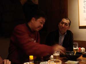 通信対戦のほうは、土居ちゃんの勝利で終了。 クロちゃんが2位で、ビリはやっぱり石川キンテツ。 午後6時30分。みんなで「越後叶家」へ。 風が寒い。 メンバーは、私、嫁、土居ちゃん、岩崎誠、川田忠之くん、三井啓介 くん、込山勉くん、小坂晃弘くん、井沢どんすけ、前田圭士、クロちゃ ん、石川キンテツ、石坂ちなみちゃん と、マネージャー。 すごい人数だ。 別に理由があって集まったわけではないのだけれど、これだけの人数 なので、名目を「新年会」にして、乾杯〜〜〜!