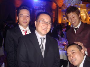 うちは、後ろの隅っこのほうで、陣内家の比較的近く。 野球場でいえば、外野席の最上段。 ここならテレビに映る心配もないからと、また安心。 バッファロー吾郎の木村明浩くんが挨拶に来てくれたので、一応お約 束で「ホテルの方ですか?」と、ギャグをいう。