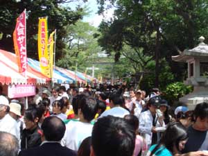 まだ開催時間から10分ぐらいしか経っていないんだよ。 このままお昼を迎えたら、どうなっちゃうの? 午後になったら、もっと人が増えるでしょ? 予想観客動員数は、この2日間で10万人が予定されている。 JR身延線は、臨時列車を増発したというし、東京からの直行観光バ スのツアーも企画されたそうだ。 でも1日5万人のお客さんをどうやって、この狭い浅間大社の境内に 収容するつもりなんだろう。 今年私はスカイ・パーフェクTV「サイコロまかせ〜桃鉄の旅」のロ ケでここに来ているだけに、狭さをよく知っている。 行列に並んでいる人に、係員の人が「前後の人の顔を覚えておいてく ださーい!」と叫んでいるけど、社会保険庁の記入ミスじゃないんだか ら、ロープぐらい張るべきだ。 やっとB級グルメを買えた人も、食べる場所がなくて、川っぷちに腰 掛けて食べるのが、やっと。 あちこちで、子どもがビービー泣いている。 当然だろう。