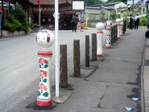 正統派のこけしより、玩具としてのコマのほうが私には興味がある。 そういえば、私でも鳴子のこけしは首がキュキュッと鳴ることを知って いるが、どのお店でも「首を鳴らさないでください」と書いてあって、鳴 らせないのが、残念。 駅前の商店街を下っていく。
