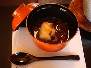 朝食前にいただく「おめざ」のつもりで、わらび餅をツルッと食べる だけなので、楽チンな撮影だとおもったら、お店の人がサービスで、い つも京都駅の帰りに駅で買う黒豆しぼりを出してくれた。 これは大好きなので、断わる理由がない。