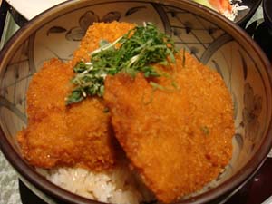 このたれかつ丼は、新潟の郷土料理で、この「新潟・食楽園」で1年 前くらいからメニューに加わっていたんだけど、どういうわけか来る度 にメニューになくて、いつか食べたいとおもっていた。 たれかつ丼は、玉子をとじないタイプのとんかつで、とんかつを甘辛 醤油ダレをくぐらせたシンプルな食べ物。 小坂晃弘くんは、大学が新潟だったので、こういうタイプのとんかつ の存在を知っていた。