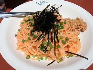 きょうも陽射しが強いので、オープンテラスで日光浴をしながら。 私は、蒸し鶏と青ネギの和風ソース。 嫁は、辛子明太子和えに、納豆。