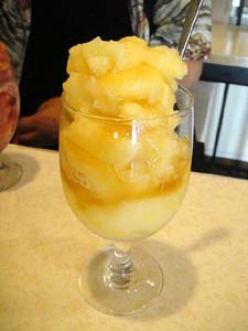 ん? ガリガリッと来ない。 スムージーみたいだ。 味も淡い。 おいしいんだよ。 おいしいんだけど、きめ細かい氷で、およそカキ氷っぽくない。 くちのなかで、しゅわ〜と溶けてしまう。
