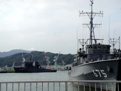 お水のペットボトルの名前が「東郷源水」。 「東郷源水(とうごうげんすい)」。 「東郷元帥」と掛けてあるのだ。 『アド街ック天国』で、薬丸印の新商品に選ばれそうな名前だ。 舞鶴東港に出る。 海上自衛隊の船が停泊している。