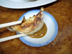 甘みのあるギョーザを、キューリの丸漬けのタレにつけて食べると、 最高においしいんだ。