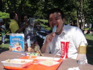 「キャハハ! そっくり!」 子どもたちにも、馬鹿ウケ! しかも、石川キンテツ、ちゃっかりガリガリ君を食べている。 あ〜〜〜! 暑いんだけど、さわやかな風が吹いて気持ちいい。 柿添家族と、ランチだけいっしょに取って、さっさと帰るつもりが、 あまりにもまったりとして、重い腰が上がらない。 すっかり片側の顔だけ日焼けしてしまった。 しかも「あ〜〜〜、こうやって、たまにはのんびりする時間も必要だ なあ…」と思った瞬間、『桃太郎電鉄KINKI』で、糸がこんがらがって、 ほどけなかったアイデアが、1本の線になった。 まったく、のんびりできない性格だよ。 午後3時。帰宅。 『桃太郎電鉄KINKI』の仕様書作り。 ミッドタウンで解けたアイデアを仕様書にする作業。 午後6時30分。嫁と、新宿の「王ろじ」へ。