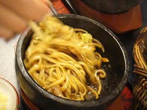 店長の村上陽心(あききよ)くんが説明してくれた。 「へー! 自分で作るつゆ焼きそばなの? おもしろいね!」 「最初は、石鍋で黒石焼きそばを焼いて、そのまま食べます。次に、石鍋 のなかに、和風スープを入れます」 「へー! ラーメン・スープじゃないんだ!」 「この石鍋は、300度ですので、さわらないでくださいね!」 「300度!」 「で、この石鍋に、温泉卵と、紅しょうがと、海老天を入れます」 「ゴージャスだねー」 「最後に、このつゆ焼きそばのなかに、ご飯を入れます」 「わー! 血圧高くなりそー!」 「ひつまぶしみたいな食べ方ですね!」 このつゆ焼きそばを作るのは初めてなので、お店の人が実演してくれ て、みんなが真似た。